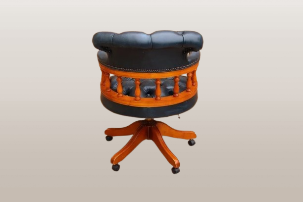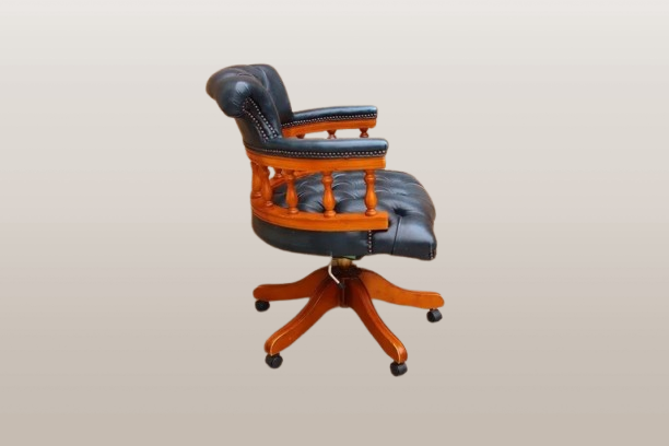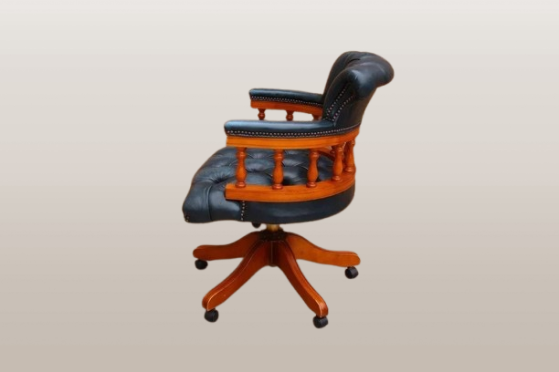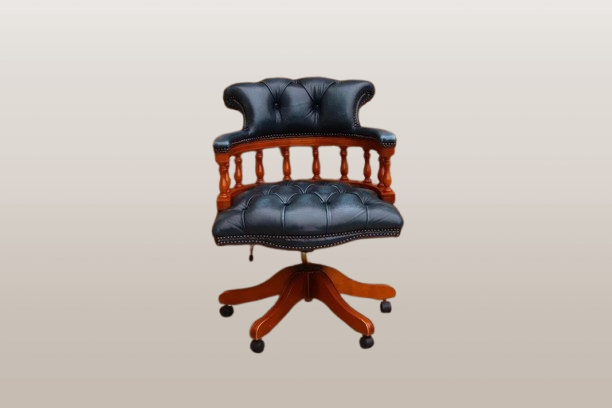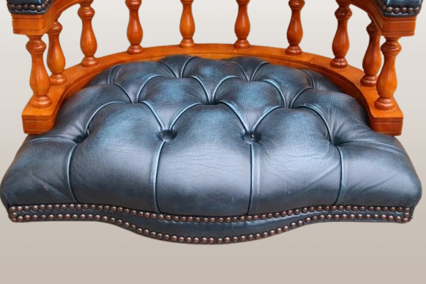 Kapitono kėdė demonstruoja natūralų grožį iš dviejų atspalvių senovinės mėlynos natūralios odos, papildytos vintažinėmis smeigėmis ir paminkštintomis rankovėmis, taip pat medžio dirbiniais.