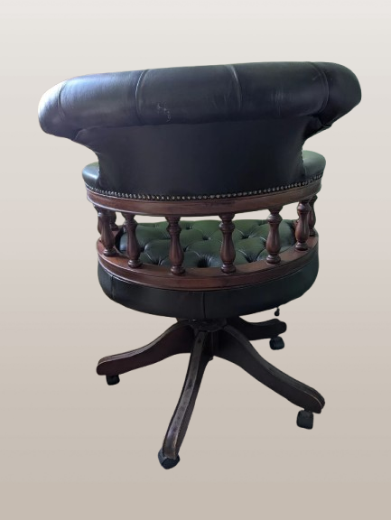 Sukurta su nesenstančia elegancija, kuria garsėja Chesterfield, ši kapitono kėdė yra išskirtinė detalė, kurioje praktiškumas derinamas su klasikiniu stiliumi. Kėdė turi tvirtą antikvarinio žalio atspalvio odinį apmušalą, papildytą sodriais mediniais akcentais, sukuriančią rafinuotą ir jaukią išvaizdą. Ši kėdė yra 91 cm aukščio, su pasukamu pagrindu, todėl ji yra ne tik stilinga, bet ir praktiška, idealiai tinkanti bet kokiam kambariui suteikti išskirtinumo.