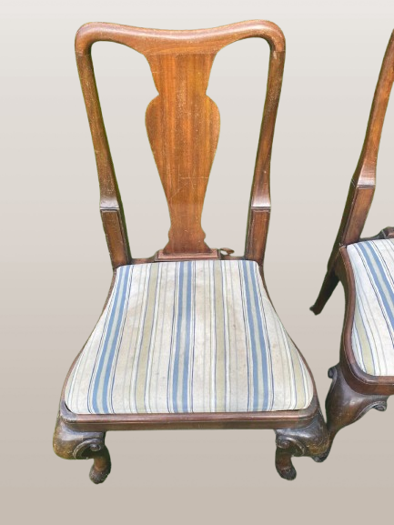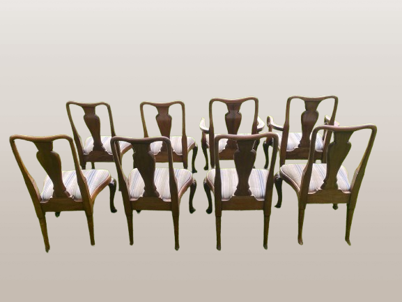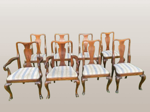 Karalienės Anos stiliaus raudonmedžio valgomojo kėdžių komplektas, 8 vnt.