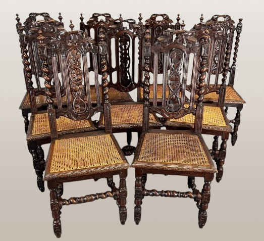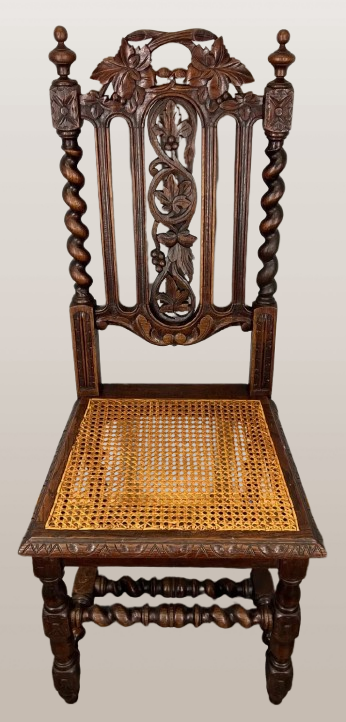 Suteikite savo valgomojo erdvei elegancijos su šiuo nuostabiu senovinių prancūziško raižyto ąžuolo valgomojo kėdžių rinkiniu, pasižyminčiu išskirtiniu meistriškumu ir sudėtingomis detalėmis. Kiekvienoje kėdėje yra gražiai rankomis raižyti atlošai, puošti gėlių ir vynmedžių motyvais, kuriuos papildo susuktos kolonos ir įmantriai austos rotango sėdynės. Dėl nesenstančio dizaino jie puikiai papildo tradicinį, vintažinį ar klasikinį interjerą.