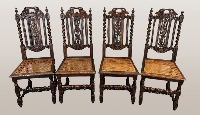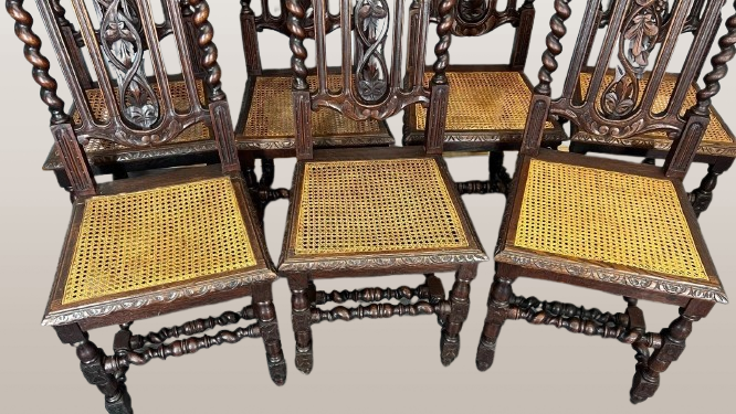 -11%Antikvarinės prancūziško raižyto ąžuolo valgomojo kėdės su rotango sėdynėmis – 3594 dalis